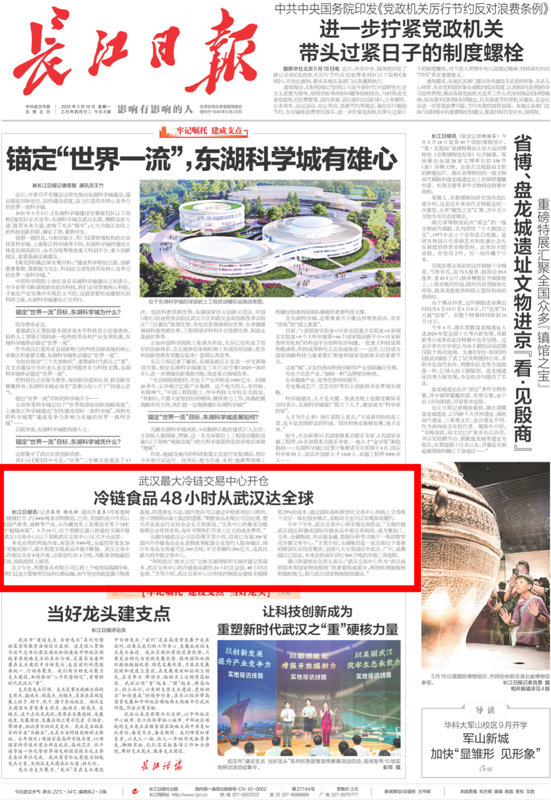 冷庫卷閘門緩緩打開,約3000噸來自阿根廷、巴西、美國的進口牛肉以及國產(chǎn)禽類、海鮮等產(chǎn)品,從冷藏貨車上直接送至零下18℃的“超級冰箱”。5月18日,位于黃陂區(qū)灄口街道的玉湖冷鏈(武漢)交易中心(以下簡稱武漢交易中心)正式開倉運營,這也是華中地區(qū)單體最大的冷鏈交易中心首倉。