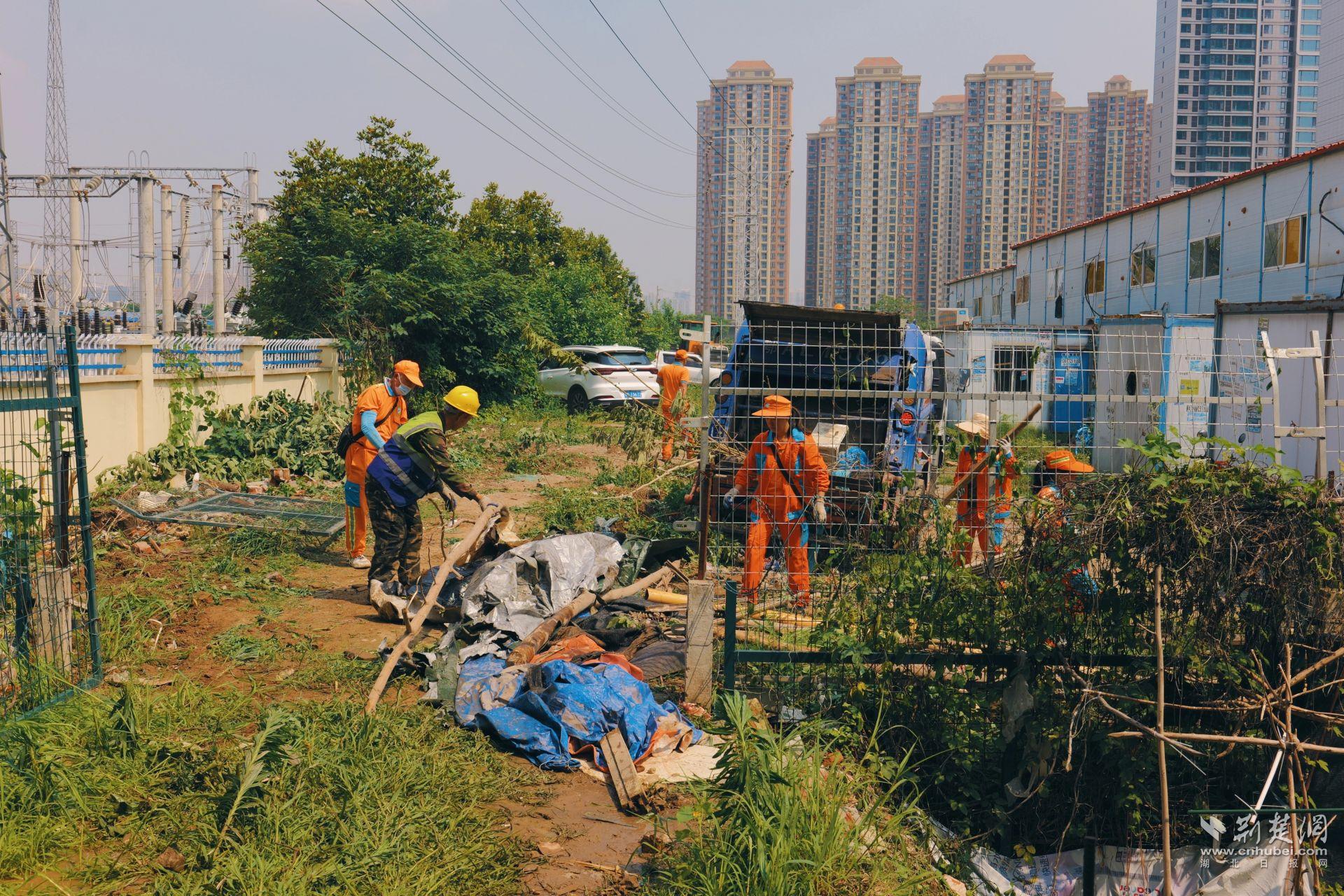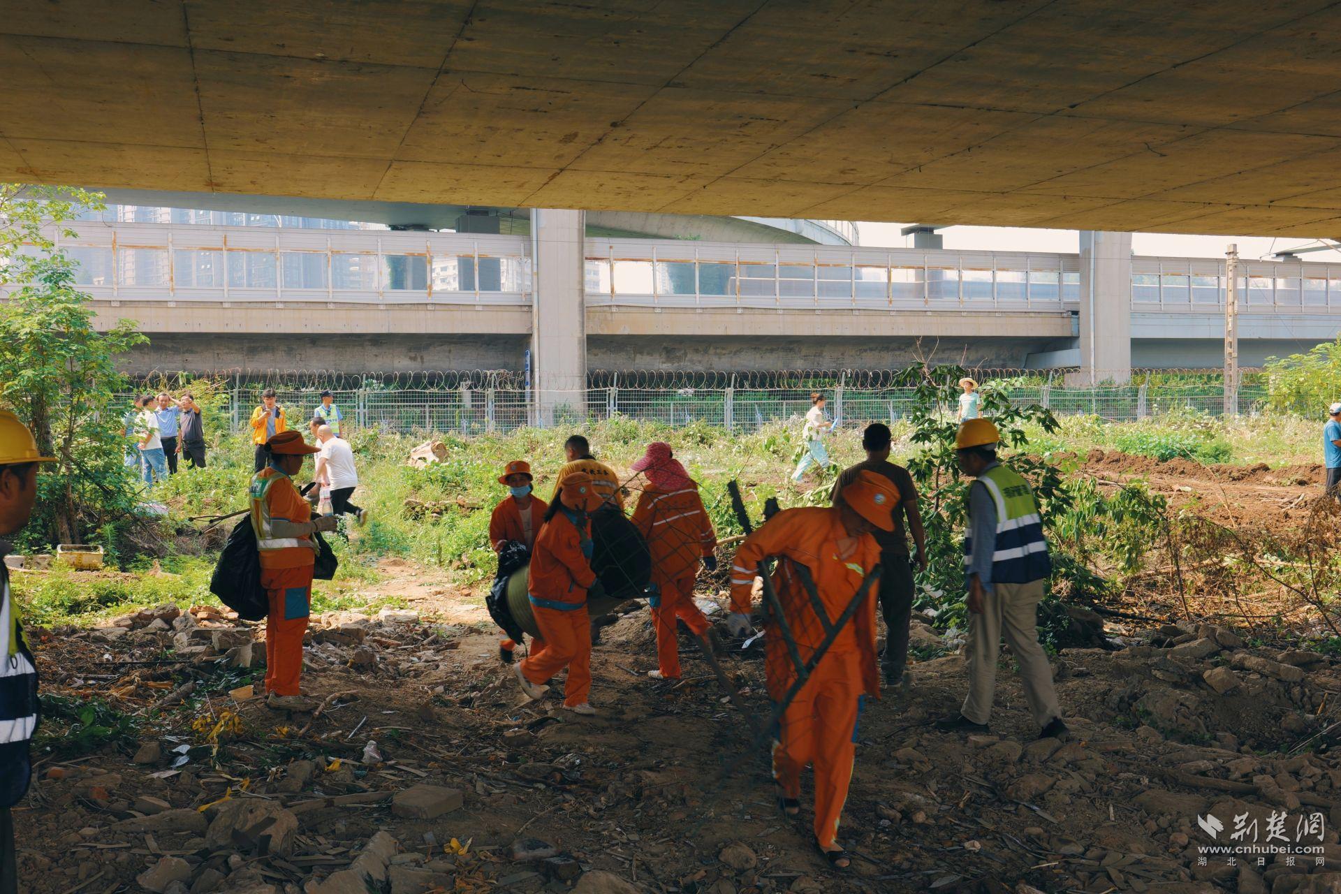 在區(qū)城管局牽頭動員下,執(zhí)法人員、環(huán)衛(wèi)力量聯(lián)合新村街道的干部職工、社區(qū)工作人員及武漢高鐵工務段技術(shù)人員以及公安干警們,共同組成200余人的攻堅隊伍,同時調(diào)度3臺大型挖掘機和4輛垃圾清運車,對鐵路橋下約3200平方米的“臟亂差”區(qū)域展開了拉網(wǎng)式清理。