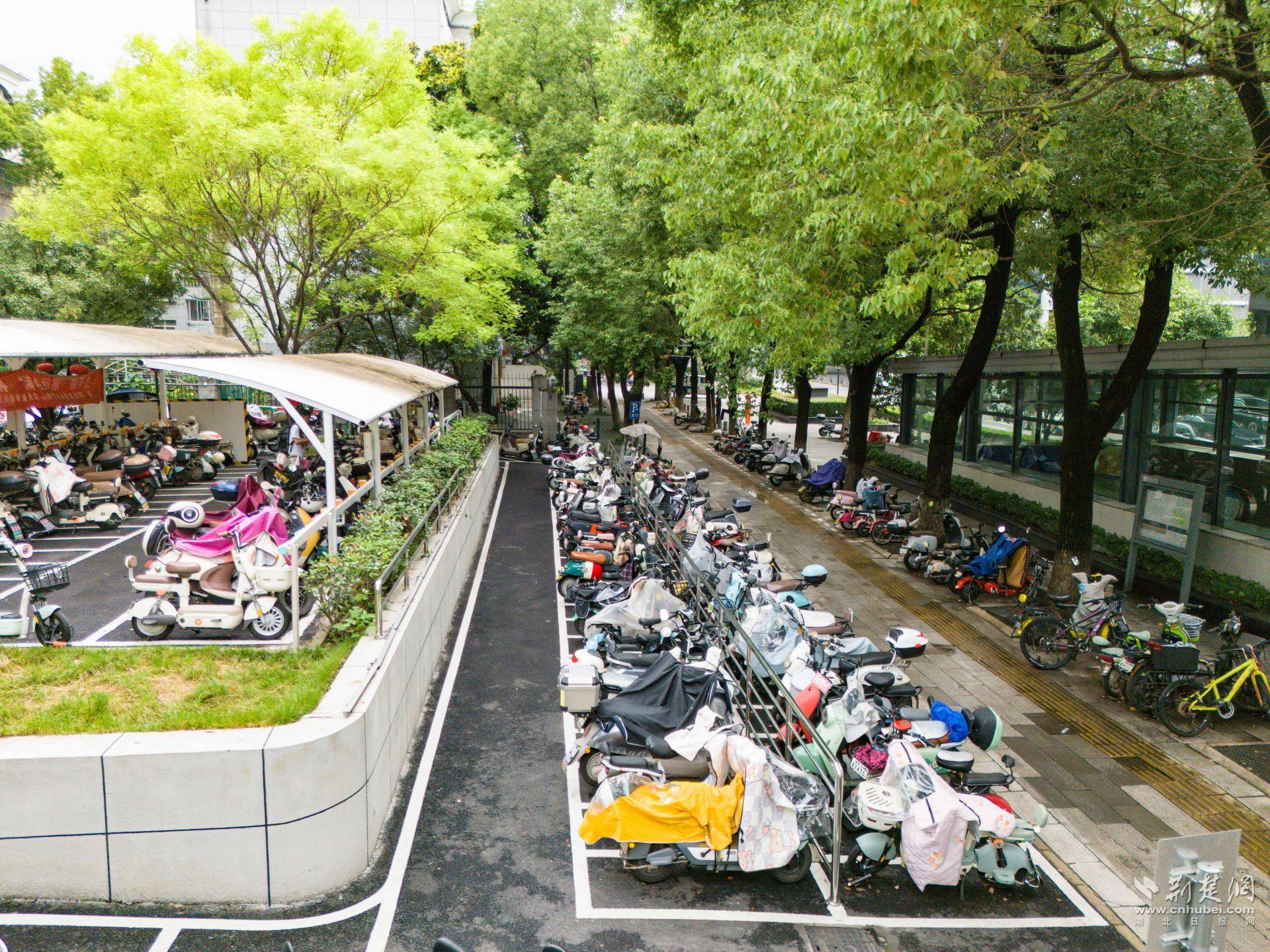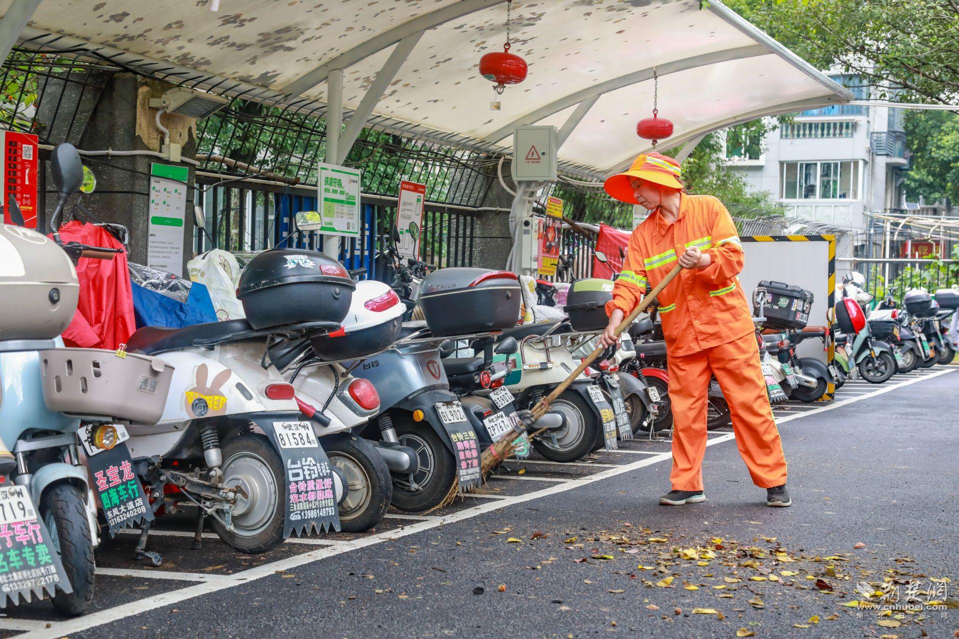 體育中心一帶人流密集,周邊高校、商圈、居民區(qū)扎堆,非機(jī)動(dòng)車(chē)保有量大,亂停亂放、私拉亂接的現(xiàn)象一度突出?!霸缤砀叻宓臅r(shí)候,電動(dòng)車(chē)能‘插’到哪就停到哪,充電線從窗戶、欄桿上扯下來(lái),既不安全也不好管?!必?fù)責(zé)這一片區(qū)巡查的城管隊(duì)員陳強(qiáng)說(shuō),最多的時(shí)候一條路邊能擠幾十輛車(chē)。
