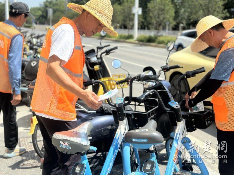 荊楚網(wǎng)(湖北日?qǐng)?bào)網(wǎng))訊( 通訊員 韓時(shí)珺)7月30日上午10時(shí),武漢東湖高新區(qū)關(guān)東街道熱浪翻涌。十余名身著橘色工裝的環(huán)衛(wèi)工人,正細(xì)致地清理著共享單車車身上的“牛皮癬”——那些惱人的小廣告。他們手中的鏟刀與抹布上下翻飛,清除污漬的同時(shí),也順手將路邊的共享單車一一擺放齊整。汗水浸透衣衫,卻無(wú)人停歇。