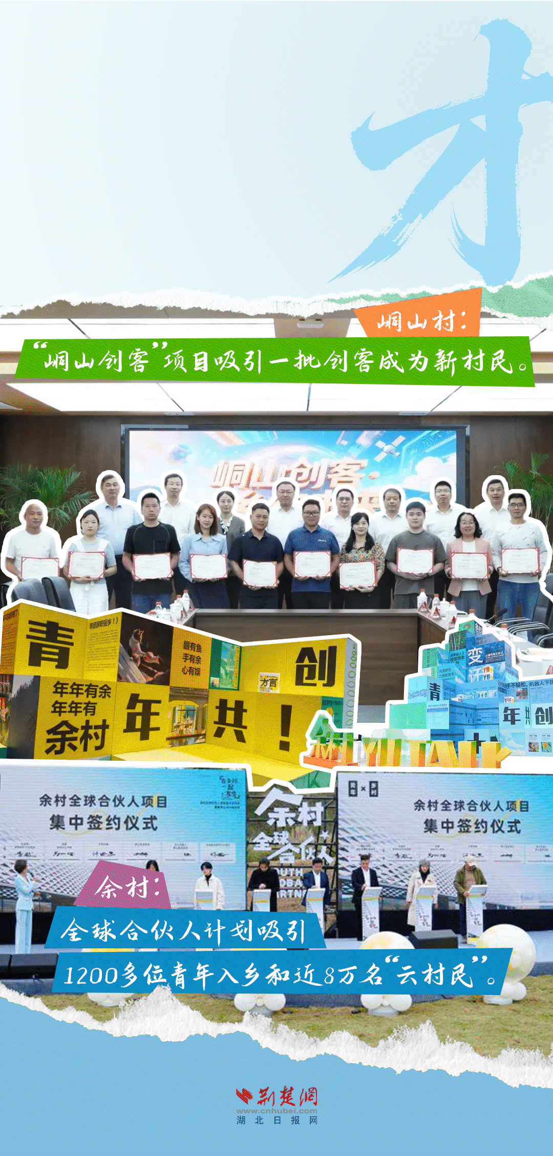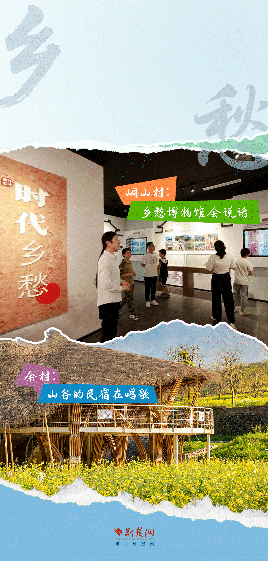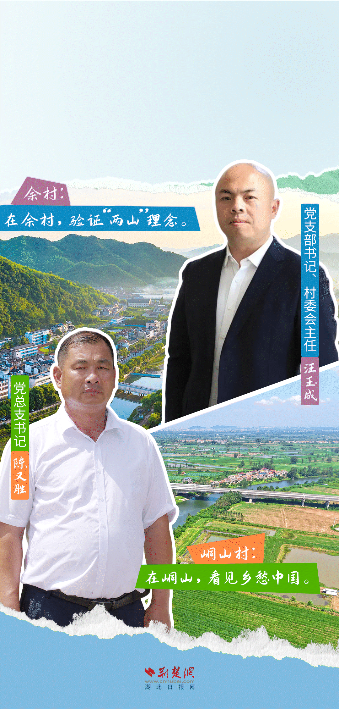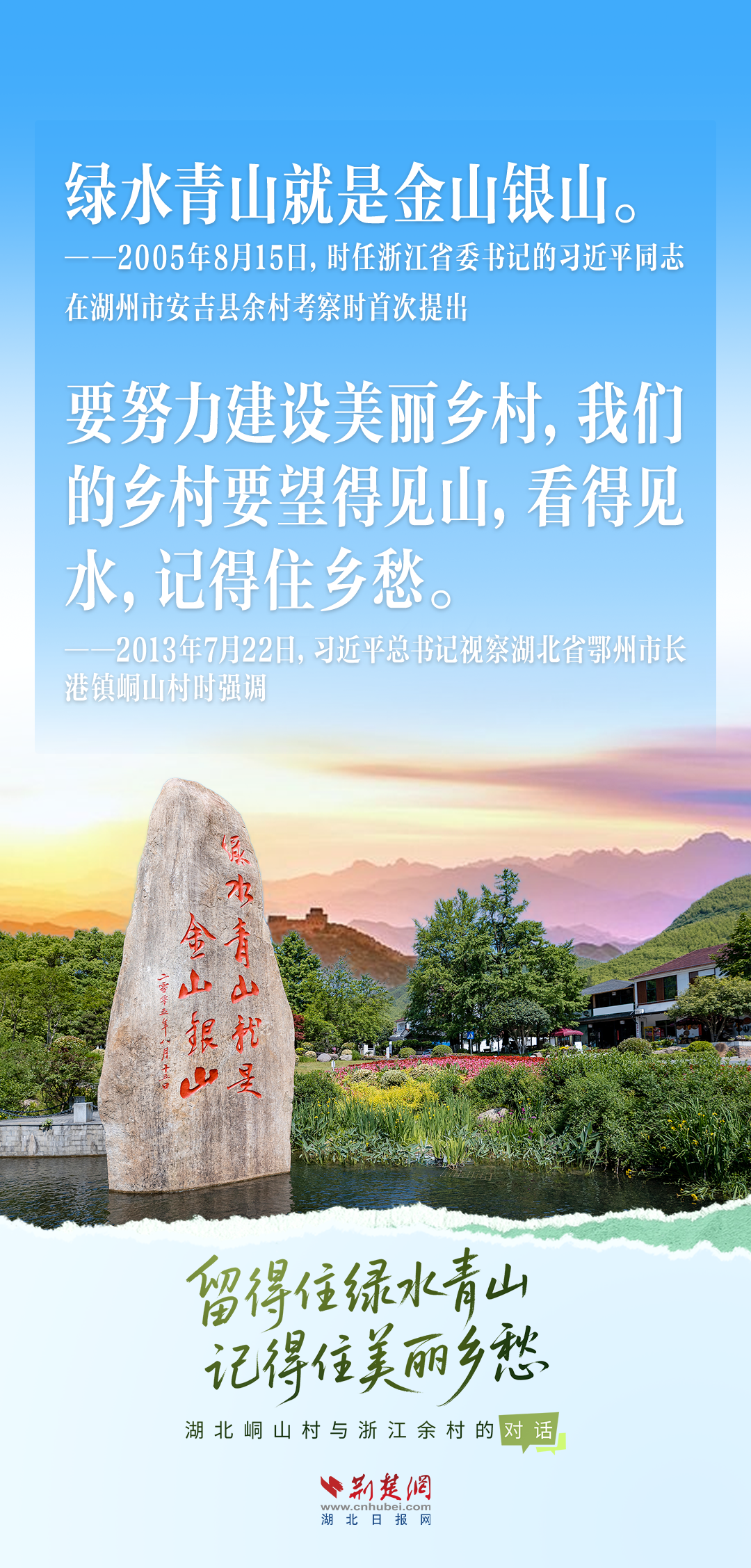 今天,荊楚網(wǎng)(湖北日?qǐng)?bào)網(wǎng))推出創(chuàng)意海報(bào)《留得住綠水青山,記得住美麗鄉(xiāng)愁——湖北峒山村與浙江余村的對(duì)話》,展示中國(guó)鄉(xiāng)村的美麗畫卷。