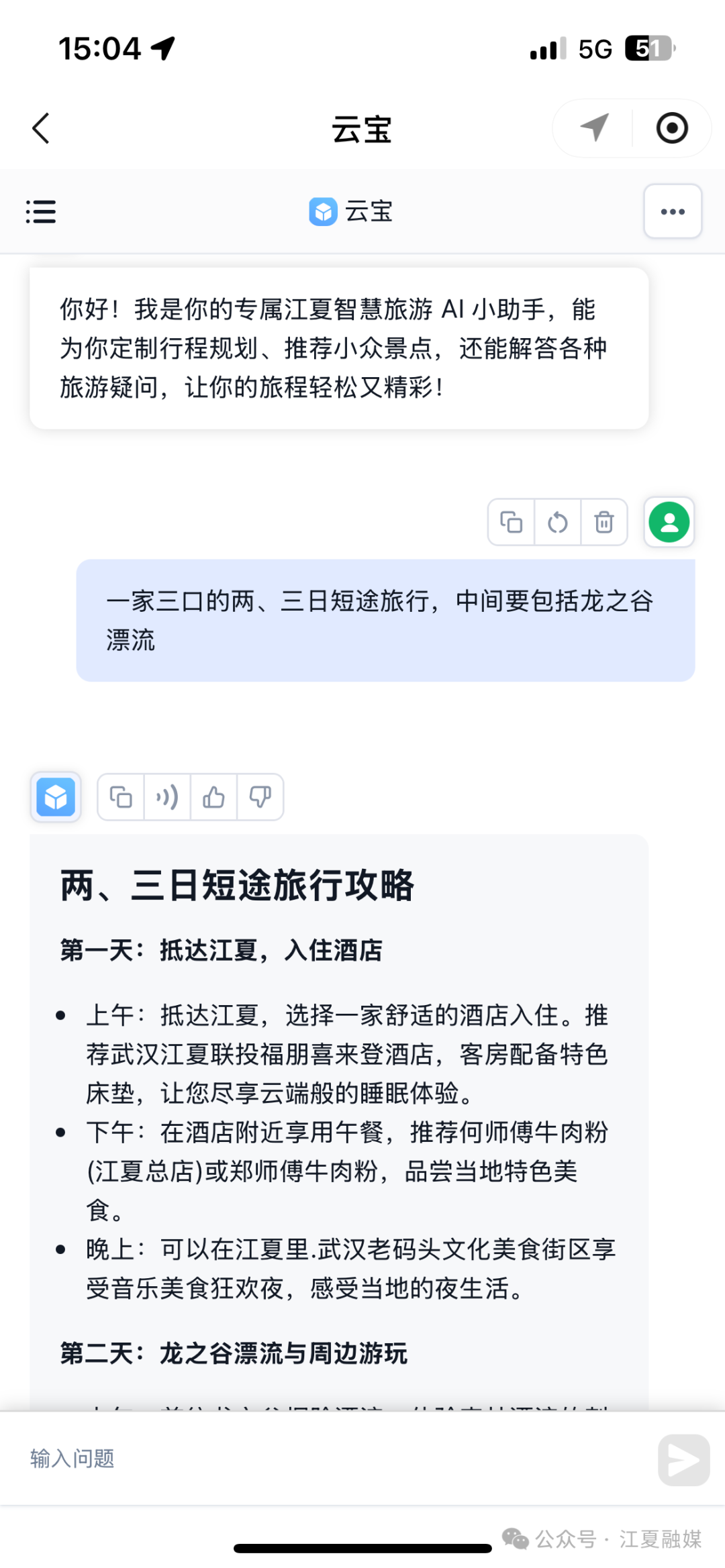 今年5月,基于騰訊元寶大模型,“云游江夏”小程序上線一款獨家AI——云寶,通過智能化技術全面升級游客體驗,同時為景區(qū)管理注入數(shù)字化活力。借助AI智能導游和個性化推薦功能,游客可享受定制化行程規(guī)劃;同時,AI即時應答服務則能快速解決如查找景區(qū)信息等實用問題,大幅提升出游便利性。