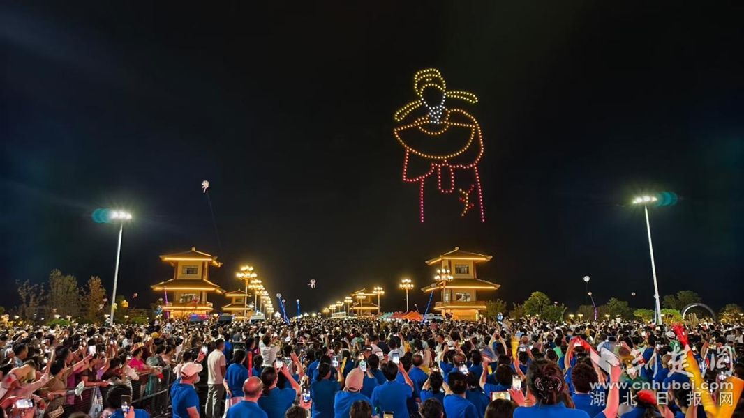 夜幕中,三百架無(wú)人機(jī)騰空而起,伴隨著悠揚(yáng)的黃梅調(diào),在天空中次第變幻出黃梅戲服、“莫錯(cuò)過(guò)”字樣等立體光影圖案,與兩岸璀璨燈光交織成一幅科技與藝術(shù)深度融合的絢麗畫卷,引來(lái)觀眾驚嘆連連。