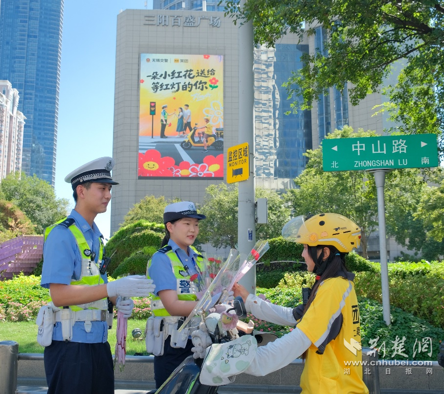 荊楚網(湖北日報網)訊(通訊員小雨)8月29日七夕當天,美團在西寧、鄭州、蘭州、深圳、武漢等全國16座城市同步發(fā)起“送你一朵小紅花”交通安全倡導行動。各城市交警在十字路口、斑馬線前為遵守交通規(guī)則的騎手和市民送上鮮花及反光貼紙,傳遞“安全出行”理念?;顒蝇F場,近萬人領取到倡導交通安全文明的“小紅花”。據了解,這是美團在全國發(fā)起的騎手交通安全正向激勵系列活動之一,旨在推動騎手交通安全意識提升與權益保障的常態(tài)化。