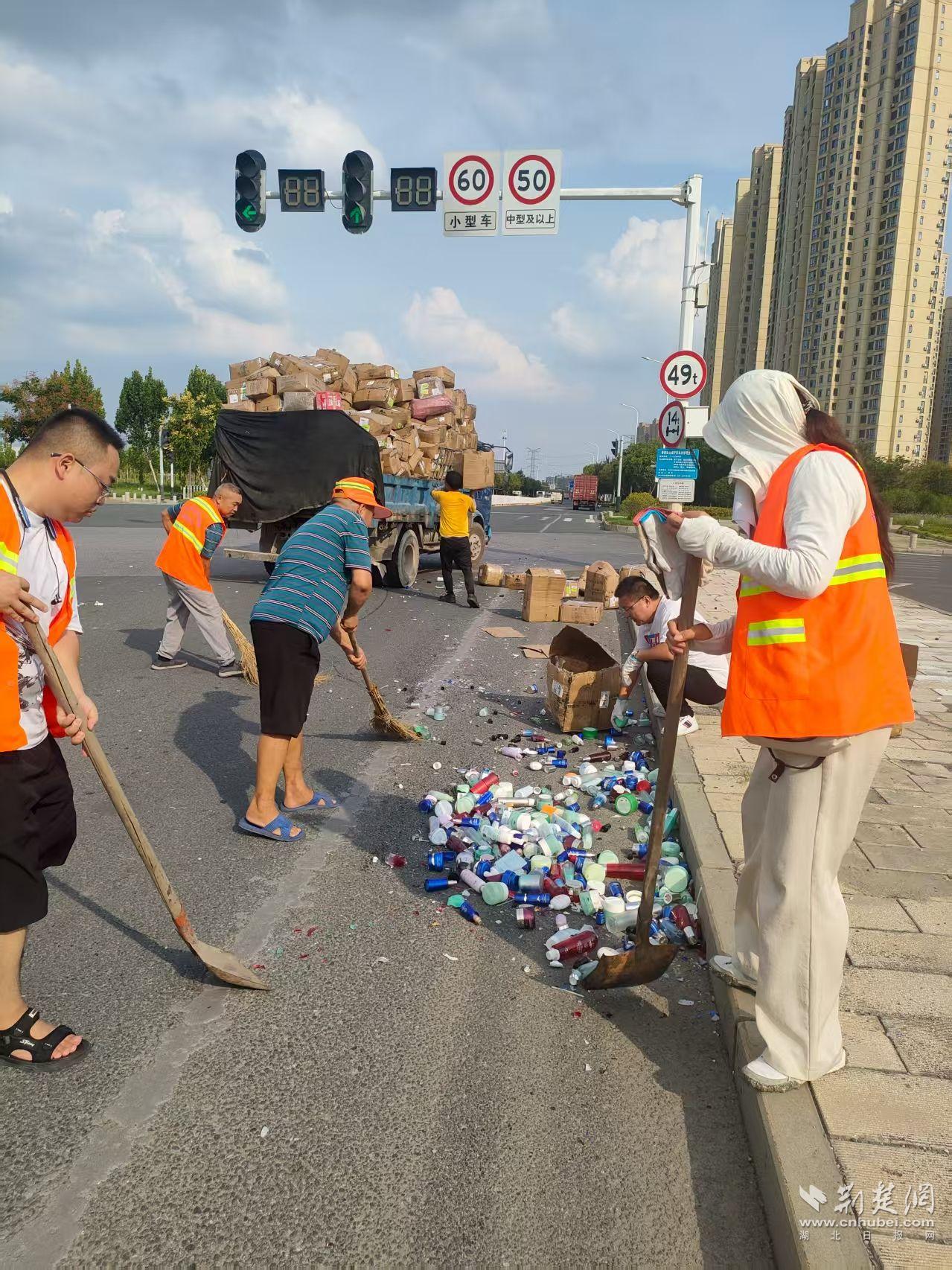 荊楚網(wǎng)(湖北日報網(wǎng))訊(記者 何婧 通訊員 汪玉平 朱小玲)9月3日下午,武漢市東西湖區(qū)東吳大道與高橋五路交叉口紅綠燈處,一輛貨車因轉(zhuǎn)彎過急,車上十余箱化妝品散落一地。瓶罐滾落、碎片遍地,不僅阻礙通行,還存在安全隱患。