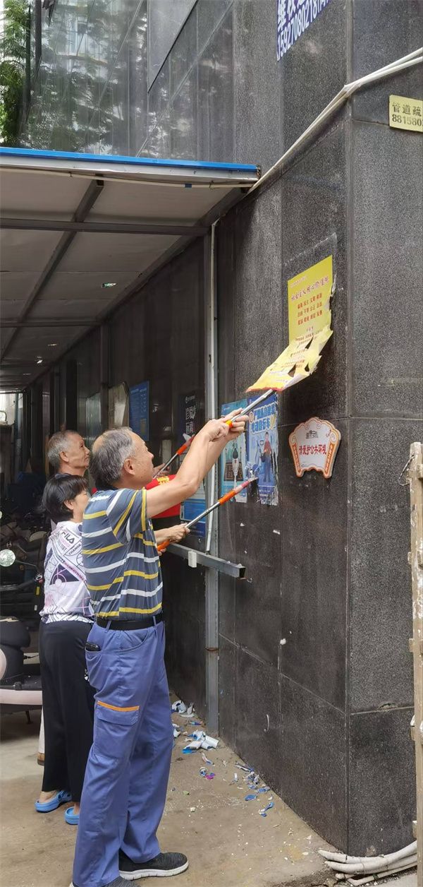 行動中,志愿者們分為兩組,分工協(xié)作、高效推進(jìn)。“牛皮癬”清理組攜帶專業(yè)工具,對小區(qū)各樓棟墻面、單元門、電梯間及公共設(shè)施上的各類小廣告進(jìn)行徹底清理。面對黏附牢固的廣告貼紙,大家先以噴壺濕潤軟化,再細(xì)致鏟除,最后用抹布擦拭干凈,不遺漏任何一處衛(wèi)生死角。