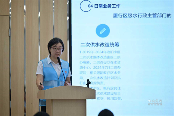活動(dòng)開場(chǎng),武昌區(qū)水資源管理服務(wù)中心主任周妍圍繞《武昌區(qū)水務(wù)和湖泊局及水資源管理中心工作職責(zé)》展開解讀,清晰梳理水務(wù)部門在水資源調(diào)配、供水保障、設(shè)施維護(hù)等方面的職能;同時(shí)深入講解二次供水改造及修繕現(xiàn)行政策,從改造標(biāo)準(zhǔn)、申請(qǐng)流程到惠民福利逐一剖析,讓居民明晰這項(xiàng)民生舉措。