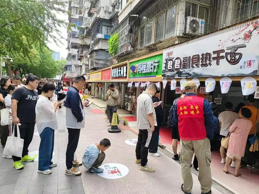 國(guó)慶中秋假期,江漢區(qū)游客量激增,君君副食的隊(duì)伍從店門(mén)口蜿蜒著排出數(shù)十米。社區(qū)志愿者舉著醒目的提示牌引導(dǎo)停車(chē),網(wǎng)格員把路邊的共享單車(chē)統(tǒng)一移走,引導(dǎo)著慕名而來(lái)的食客井然有序地排隊(duì)等候?!耙郧耙坏焦?jié)假日就發(fā)愁,客人擠得轉(zhuǎn)不開(kāi)身,現(xiàn)在有專(zhuān)人維持秩序,生意反而更穩(wěn)當(dāng)了?!钡曛饔喟⒁滩林~頭的汗笑言。