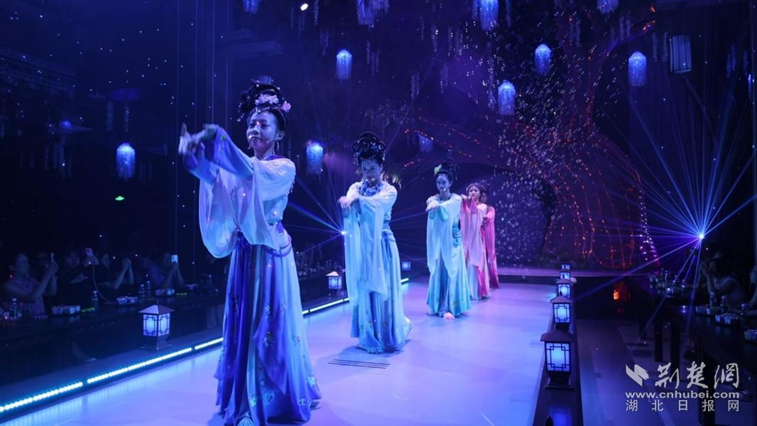 傳統(tǒng)文化的“破圈”還體現(xiàn)在味覺與視覺的融合中。黃梅戲主題餐秀綜合體“黃梅宴”內(nèi),新編劇目《天仙奇緣》與美食同步呈現(xiàn)。食客夾起黃梅魚面時,舞臺上的“七仙女”便踏云步至席間,婉轉唱段與餐香交織,讓味蕾與聽覺同時“入戲”。“原本對黃梅戲不太了解,這場表演既有古典韻味,又充滿現(xiàn)代氣息,看得非常過癮。”市民石海珠觀演后贊嘆。