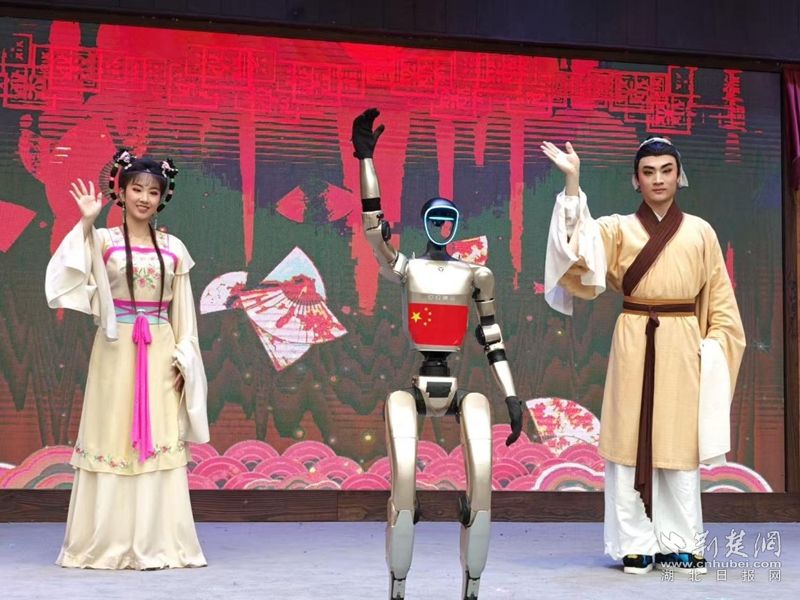 荊楚網(wǎng)(湖北日報網(wǎng))訊(通訊員王晶、費留燦)國慶中秋假期,在黃梅縣東山問梅村,當黃梅戲《女駙馬》的經(jīng)典唱段響起,機器人踩著婉轉唱腔靈活擺臂、轉身,復刻戲曲身段的韻味;戲腔未落,身著傳統(tǒng)獅頭裝扮的機器狗躍至臺前,跟著鼓點騰躍撲閃,鬃毛翻飛間盡顯靈動,引得游客紛紛舉手機拍攝,鏡頭緊追這些“特殊演員”。