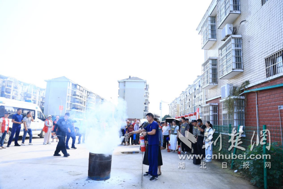 廣場一側,先由湘口街道專職消防隊帶來一場沉浸式防災減災知識課。消防隊員就滅火器的性能、用途、使用方法、設備維護等基本知識進行講解,對如何正確使用消防栓、鋪設水帶進行了展示,著重講解了滅火器“一搖、二對、三撥、四壓”的操作技巧和注意事項,并指導社區(qū)居民進行滅火器實操演練?!耙郧坝X得滅火器操作很難,掌握技巧一點不難!”參加實操的居民李大爺說道。