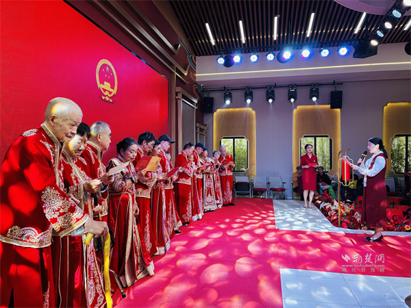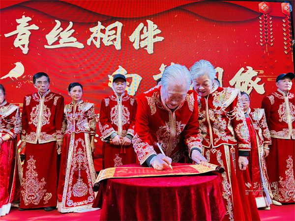 隨著輕柔音樂(lè)響起,身著中式禮服的夫婦們手挽手踏上紅毯。歲月雖在臉龐刻下痕跡,卻擋不住眼中對(duì)彼此的溫柔。他們共同執(zhí)筆書(shū)寫(xiě)婚書(shū),一撇一捺間重溫“執(zhí)子之手”的初心;交杯共飲合巹酒,延續(xù)“同甘共苦”的承諾;交換黑檀朱砂掛件,“你一半我一半”的信物成了彼此最深的牽絆。在婚姻登記處頒證員的見(jiàn)證下,夫婦們接過(guò)“結(jié)婚紀(jì)念證書(shū)”與鮮花,現(xiàn)場(chǎng)掌聲、祝福聲此起彼伏。