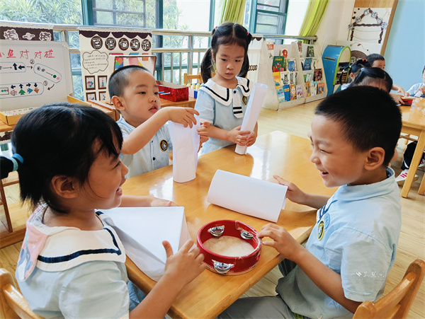 動(dòng)手環(huán)節(jié)點(diǎn)燃孩子們的熱情,四人一組的小隊(duì)伍里,小朋友們手握A4紙、膠帶躍躍欲試,有的反復(fù)卷緊紙張,力求讓紙筒更厚實(shí);有的湊著腦袋和伙伴商量,給紙筒底部貼“小支架”增強(qiáng)穩(wěn)定性。課堂里,剪刀裁剪聲、膠帶粘貼聲伴著小聲討論,專注的小身影構(gòu)成了熱鬧又溫馨的畫(huà)面。