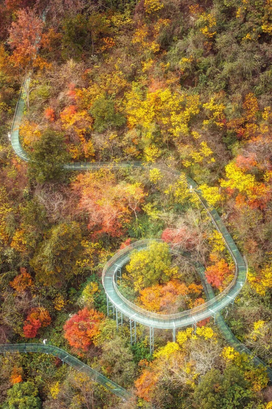 2.站在玻璃天橋俯拍腳下漫山紅葉,捕捉云端漫步的驚險與美感。