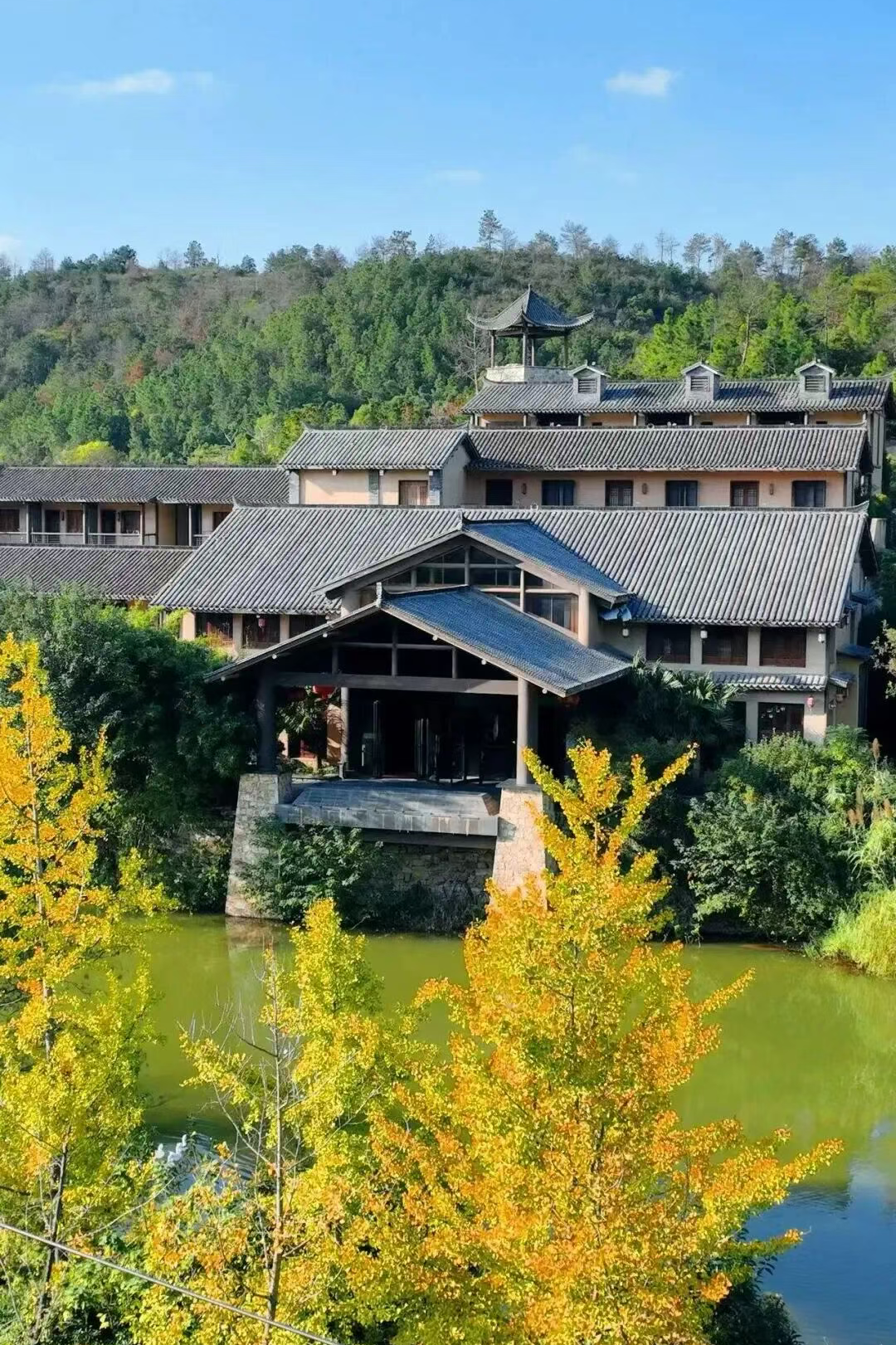3. 梯田觀景處以銀杏與烏桕色彩為前景,遠山為背景,呈現層次豐富的秋色。