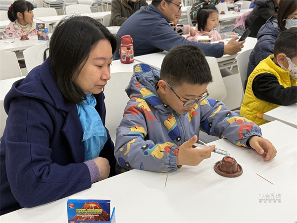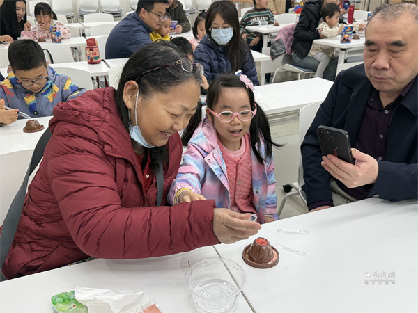 為讓抽象原理更直觀,活動設(shè)置模擬火山噴發(fā)實驗環(huán)節(jié)?,F(xiàn)場備好黏土火山模型、小蘇打、白醋等物料,容東林一邊操作一邊講解:向“巖漿腔”倒入小蘇打并加紅色素,再注入白醋,紅色“巖漿”瞬間噴涌而出,引得居民驚嘆、孩子們目不轉(zhuǎn)睛。他引導(dǎo)大家觀察全過程,深入淺出解釋酸堿反應(yīng)原理及火山灰對生態(tài)環(huán)境的影響,還邀請孩子們近距離體驗,激發(fā)科學(xué)探索興趣。