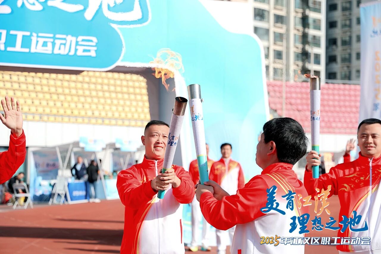 開幕式上,火炬?zhèn)鬟f成為最激動(dòng)人心的環(huán)節(jié)。前期龍王廟畔莊嚴(yán)采集的火種,承載著楚地先民的開拓精神與新時(shí)代職工的奮斗激情,穿越江漢關(guān)、長(zhǎng)江書店、中共五大會(huì)址、漢口火車站等江漢地標(biāo)抵達(dá)主會(huì)場(chǎng)。
