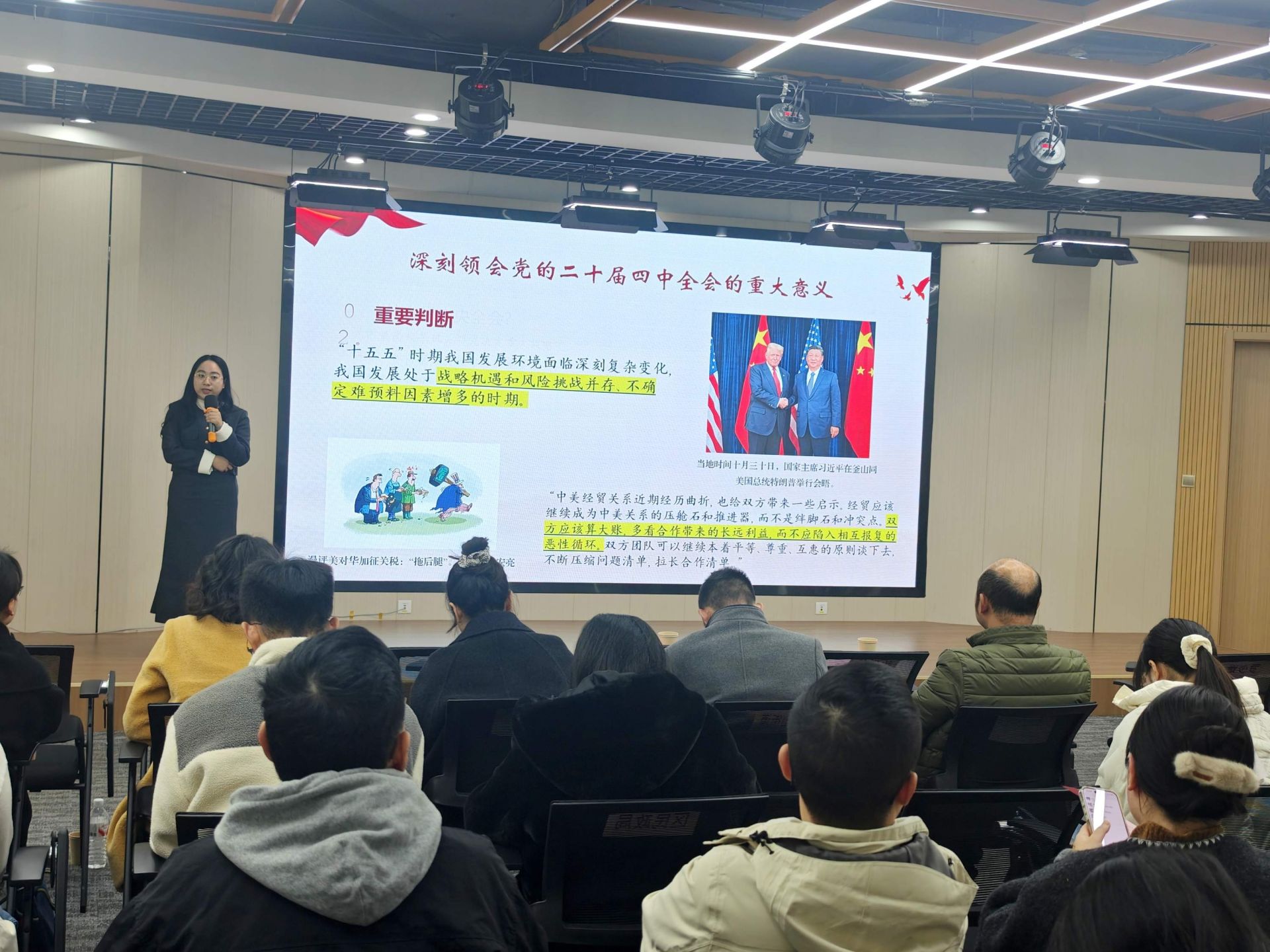 隨后,武漢市委黨校行政管理教研部教師、武漢市“青聲紅語”青年宣講隊成員吳靜怡,圍繞全會的重大意義與“十五五”時期的目標任務作了專題輔導。她勉勵在場青年將個人理想融入國家發(fā)展大局,在科技創(chuàng)新、鄉(xiāng)村振興、基層治理等一線主戰(zhàn)場挺膺擔當,以實干實績?yōu)橹袊浆F(xiàn)代化貢獻青春力量。