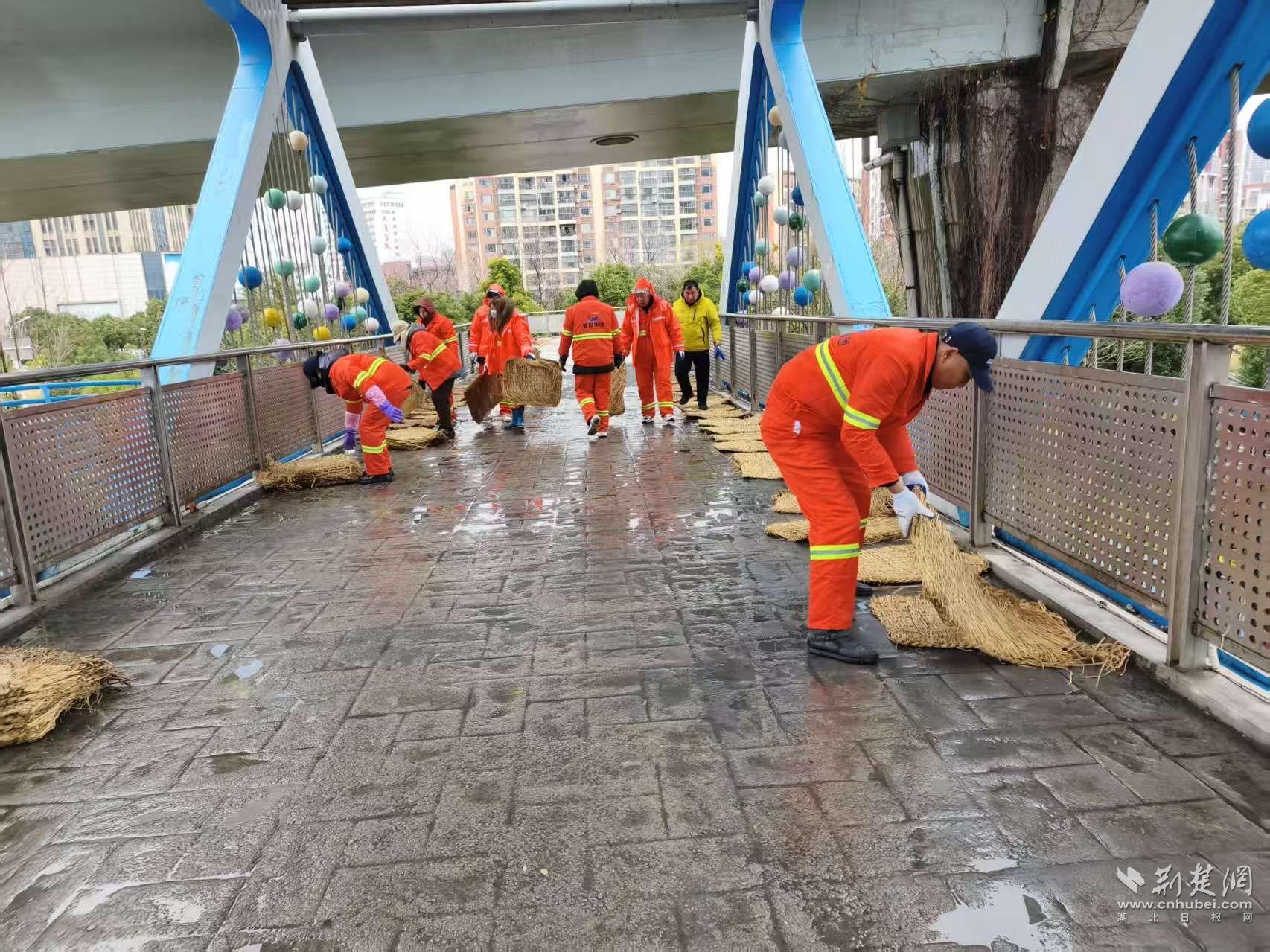 防滑措施同樣向行人集中區(qū)域延伸。19日17時起,吳家山環(huán)山路人行天橋上,環(huán)衛(wèi)工人與執(zhí)法隊員開始鋪設(shè)防滑草墊?!皹騼蓚?cè)是學(xué)校,晚高峰和早高峰人流集中,提前鋪設(shè)能減少滑倒風(fēng)險?!眳羌疑浇志C合執(zhí)法中心副主任陳偉說。