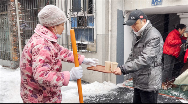“大家歇一歇,喝點姜茶暖暖身子!”正當(dāng)眾人干勁十足時,一位黨員居民端著熱氣騰騰的姜茶走來,將暖茶遞到每個人手中?!拔壹依习橹匕Y需要照顧,沒辦法和大家一起出力,只能煮點熱茶讓大家暖和一下。”一杯姜茶、一聲問候,凝聚起鄰里間最真摯的情誼,為掃雪行動更添溫情。