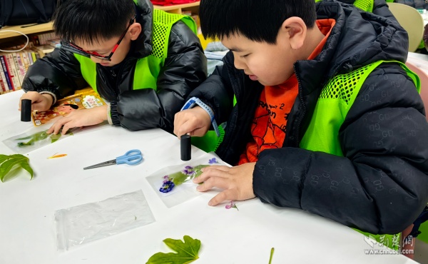 “童心造紙術·愛心拓染坊”課程把非遺技藝帶進課堂。孩子們親手體驗古法造紙,并用采集的桂花葉、香樟葉進行植物拓染,將自然的紋理留存在紙上。這些拓印作品被精心制作成新年書簽,成為送給家人的“有溫度的禮物”。
