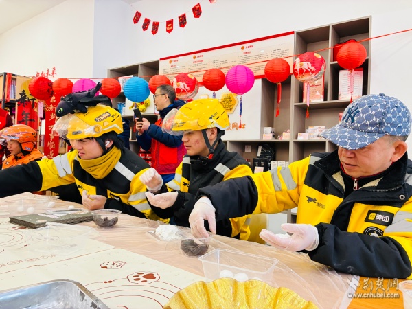 活動現(xiàn)場,手工DIY區(qū)準備了糯米粉、黑芝麻餡、豆沙餡等原材料,黃鶴樓消防站的消防員與外賣騎手、快遞員們圍坐在一起,揉面、包餡、搓圓,體驗親手制作湯圓的樂趣。