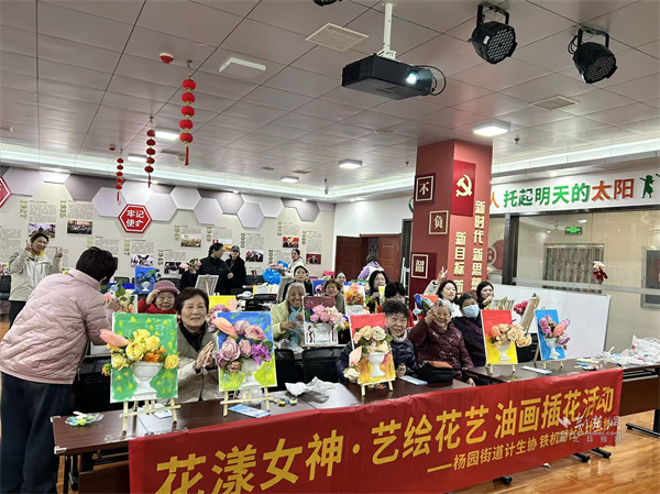 活動現(xiàn)場,長桌上整齊擺放著畫布、油彩、花材等材料。啟晨便民服務(wù)中心專業(yè)老師細(xì)致講解油畫色彩搭配、筆觸運用技巧,手把手指導(dǎo)花材修剪、造型搭配要領(lǐng),耐心解答大家的創(chuàng)作疑問。居民們興致盎然,或蘸取油彩在畫布上揮灑創(chuàng)意,暈染出五彩斑斕的專屬畫作;或?qū)W⑿藜艋ㄖΑ⒋钆鋵哟?,一束束生機盎然的花藝作品接連成型,鄰里間相互交流心得、分享技巧,現(xiàn)場笑語不斷。