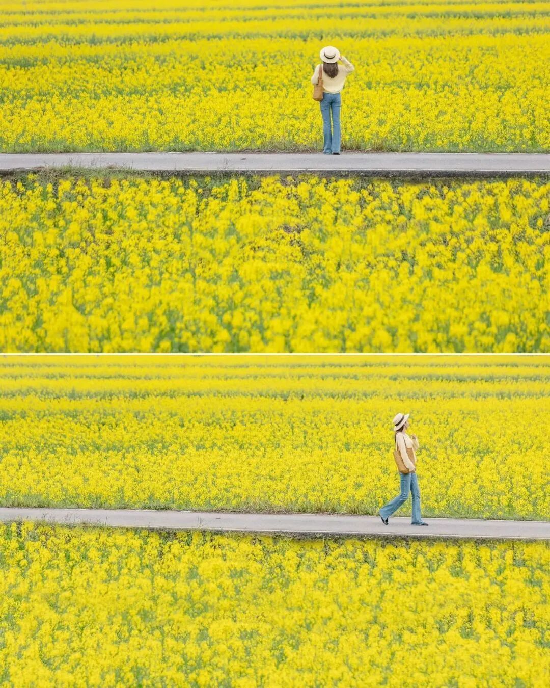 ??除了郁金香,100多畝油菜花田也正值盛花期,金黃的波浪隨風起伏,和遠處的青山、白墻黛瓦的村落相映成趣,妥妥的「治愈系田園風」天花板。