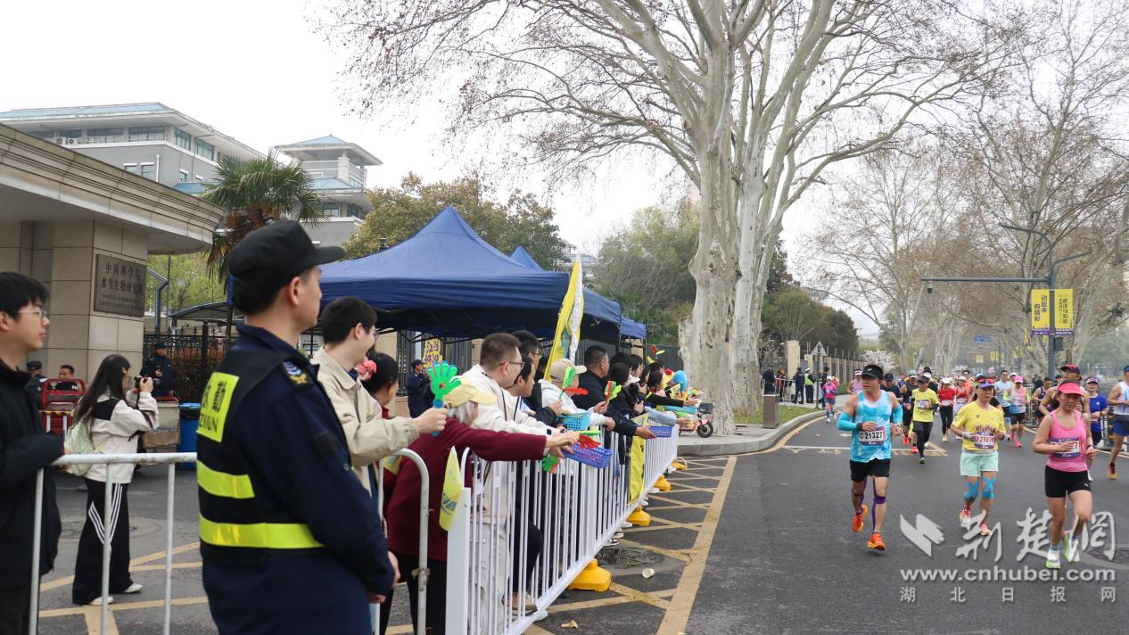 “加油!加油!”“你們是最棒的!”……當(dāng)天,位于賽道沿線的中國(guó)科學(xué)院水生生物研究所自發(fā)組織了“助威團(tuán)”??蒲腥藛T們暫時(shí)放下手中的顯微鏡,揮舞著彩旗和手舉牌,用最熱烈的吶喊為中外跑者加油鼓勁,將嚴(yán)謹(jǐn)科研之外的澎湃熱情灑滿賽道。除了吶喊助威,轄區(qū)共建單位還貼心地設(shè)置了“愛心補(bǔ)給站”,為跑者提供飲用水、水果等補(bǔ)給物資,不僅為選手們“充電”,更讓這場(chǎng)國(guó)際賽事充滿了“珞珈溫度”。