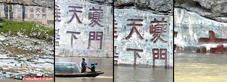 昨日上午,瞿塘峽夔門摩崖題刻中的“踏出夔巫打走倭寇”字開始沒入江中。夔門摩崖題刻頂端的水位線是126米,蓄水完后,這些字跡會被全部淹沒。當?shù)夭块T已對這些文物進行了保護。 湖北日報記者周立新攝