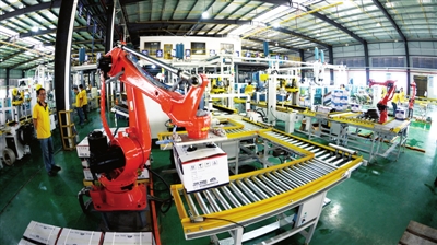 4月29日,通城縣通成高新材料有限公司運(yùn)用自動(dòng)機(jī)械手臂進(jìn)行生產(chǎn)。
