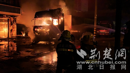 圖為消防指戰(zhàn)員撲滅貨車火災現(xiàn)場?!⌒椭螖z