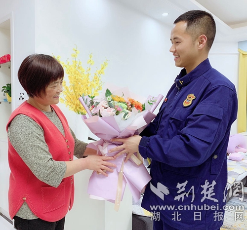 “媽媽?zhuān)@些年您辛苦了,感謝您的養(yǎng)育、教育之恩,快到母親節(jié)了,在這個(gè)特殊的日子里,今年能親手送上一束鮮花您,希望您天天開(kāi)心貌美如花……”母親節(jié)即將到來(lái)之際,咸寧特勤中隊(duì)副中隊(duì)長(zhǎng)張衡出差時(shí)利用午休時(shí)間回家送上一份母親節(jié)的禮物。