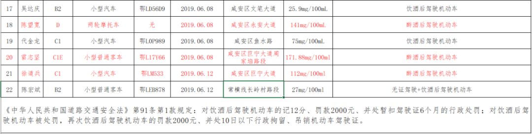 咸安公安分局交警大隊對酒駕醉駕持續(xù)保持高壓嚴管“零容忍”態(tài)勢,同時對近半個月(5月29日——6月13日)以來的酒駕醉駕駕駛?cè)诉M行實名曝光。