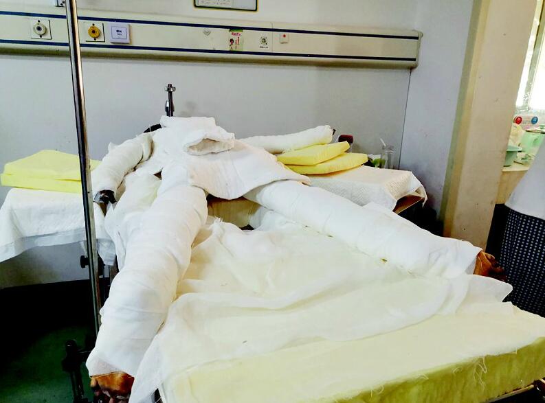 7月5日,武漢第三醫(yī)院燒傷病區(qū)。10歲的小女孩婷婷(化名),身體纏滿紗布趴在病床上,見有陌生人走來,立即垂下了頭。