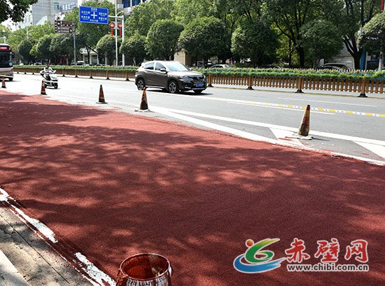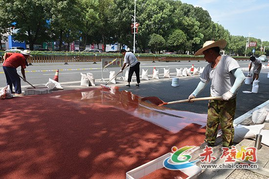 赤壁網(wǎng)消息(記者 聶愛(ài)陽(yáng))先往地面倒上攪拌均勻的膠粘劑,用推水器推平;再往上撒上陶瓷顆粒,用鐵鏟抹勻。頃刻間,一條嶄新的紅色防滑車道就這樣鋪就而成。8月6日,在赤壁市沿河大道,工人們正在緊張鋪設(shè)紅色防滑車道。