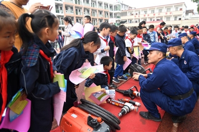 咸安區(qū)消防中隊(duì)將火災(zāi)逃生消防器材搬到演練現(xiàn)場,耐心地向?qū)W生們一一介紹空氣呼吸器、干粉滅火器、移動(dòng)式消防排煙機(jī)、無齒鋸等消防裝備器材的用處、特點(diǎn)和操作方法。通過講解消防安全和火災(zāi)逃生知識(shí)、滅火器材的使用方法,增強(qiáng)了同學(xué)們的消防安全意識(shí)和防火應(yīng)急自救技能。