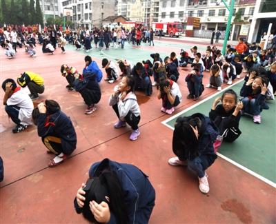 師生們一手捂著口鼻,一手扶著墻壁半蹲行進(jìn),緊張、有序、快速地撤離教室,短短的1分56秒,全校師生全部撤離到應(yīng)急避難場所——學(xué)校操場。接著,各班班主任迅速清點(diǎn)人數(shù),向校主任報(bào)告完畢,演練結(jié)束。