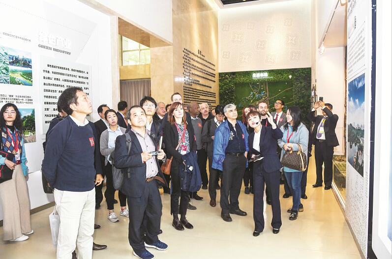 圖為:2019年10月16日,與會(huì)的中外專家學(xué)者參觀咸寧城市規(guī)劃館。