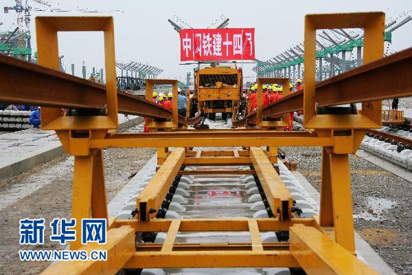 資料圖片:7月17日,中國(guó)鐵建十四局集團(tuán)京滬高鐵鋪軌工班的工人們正在鋪設(shè)通道,為正式鋪軌進(jìn)行準(zhǔn)備。京滬高鐵先導(dǎo)試驗(yàn)段北段將于7月19日開(kāi)始率先從徐州向蚌埠鋪軌,南段將于8月中旬從南京向蚌埠鋪軌,10月底將完成試驗(yàn)段鋪軌。京滬高速鐵路全長(zhǎng)1318公里,全線縱貫京津滬三大直轄市和河北、山東、安徽、江蘇四省,是我國(guó)目前最長(zhǎng)的客運(yùn)專線之一。新華社發(fā)(劉文攝)
