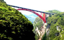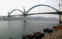 湖北宜萬鐵路野三河大橋位于湖北省恩施州建始縣與巴東縣交界處,它是一座主跨為124米不對稱雙線平行雙肋中式復(fù)合鋼管混凝土桁架坡拱橋,由中承式拱橋和下承式拱橋兩部分組成,這種不對稱坡拱橋在國內(nèi)尚屬首例。該橋由湖北省交通規(guī)劃設(shè)計院設(shè)計,于2006年3月份開工,2007年1月成功合龍。