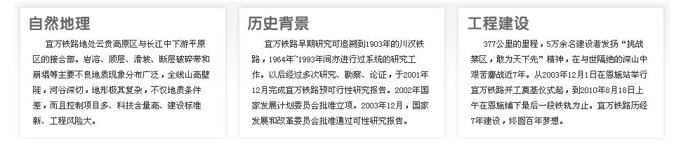 宜萬鐵路開建可以追溯到1909年12月10日,其前身是川漢鐵路,最早由詹天佑主持修建,從宜昌往秭歸修了20多公里就被迫停工。直到2003年,鐵路才重新開工。從2003年12月開工至2010年8月18日宜萬鐵路全線鋪軌貫通,耗時七年,377公里的宜萬鐵路平均每年建成里程僅50多公里,成了國內(nèi)修建時間最長鐵路。