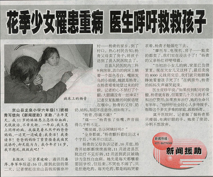 京山縣一對先后患上急性白血病的少女,妹妹已于一年前不幸夭折,姐姐楊青在死亡線上苦苦掙扎。父母為治療姐妹倆的病,花光了所有積蓄,仍不能湊夠移植骨髓所需的幾十萬元手術(shù)和治療費用,已經(jīng)陷入絕望。但是,才14歲的楊青不肯向悲慘的命運妥協(xié),她寫信給報社:“我不想死,我要讀書,救救我吧!”